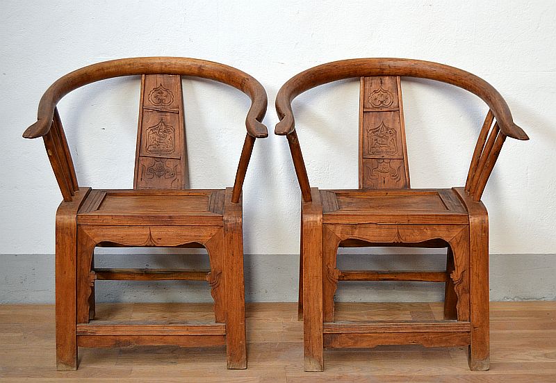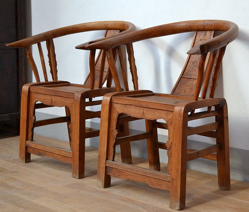 Antiche sedie Cinesi in legno di cipresso piegato a vapore di manifattura cinese, dinastia Qing (1644-1911). La coppia di antiche sedie cinesi è un raro e pregevole esempio della produzione del mobilio cinese di epoca Qing con caratteristico schienale a ferro di cavallo, finemente intagliata con motivi della tradizione imperiale patina biondo antico. Originariamente era destinata agli ospiti importanti.
