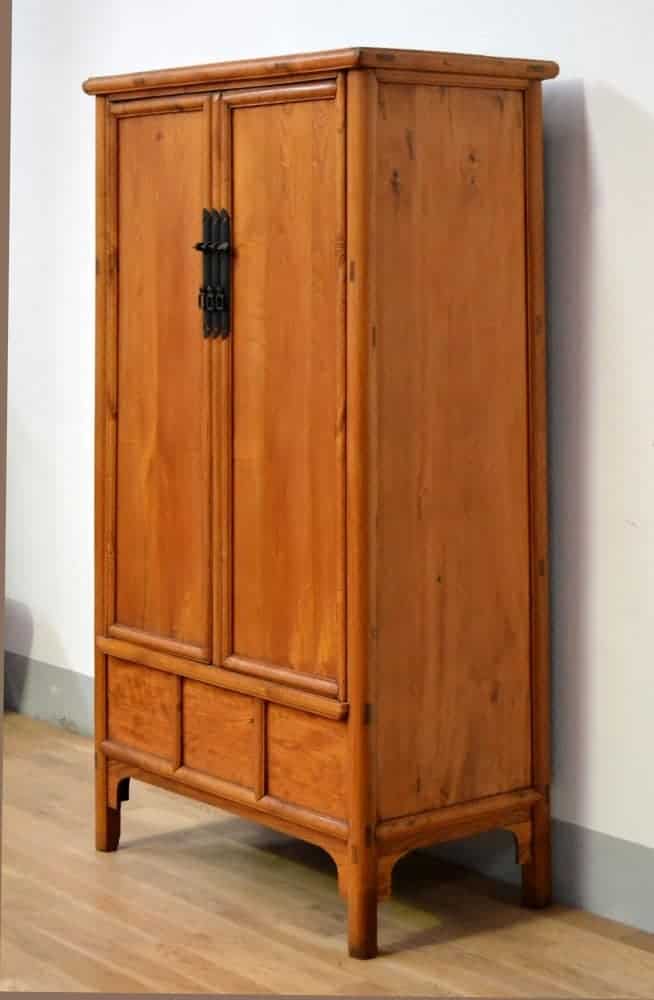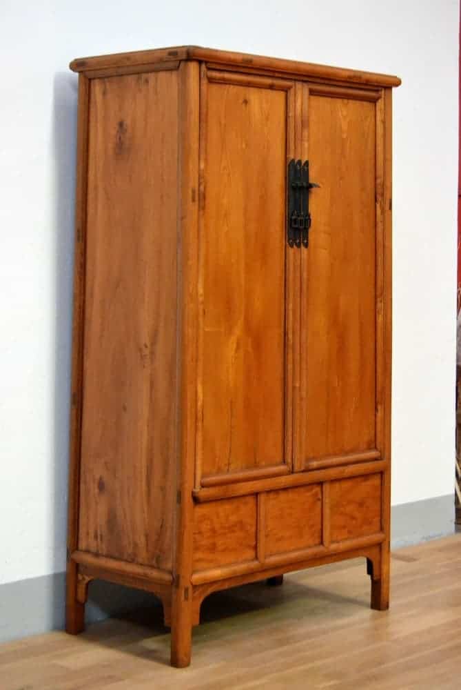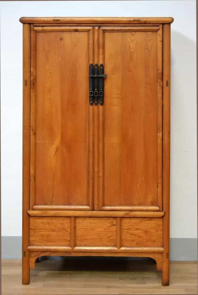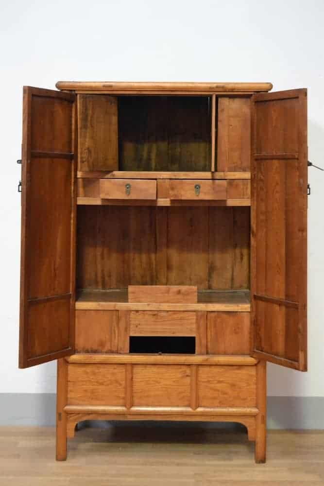 Antico Armadio Cinese in olmo massello con caratteristica forma s trapezio risalente alla dinastia Qing in patina originale. L’olmo è chiaro marezzato, molto raro ed elegante. La struttura di questo antico armadio cinese è molto pesante, con 2 Sportelli e un vano corredo all’interno nella parte inferiore. Le parti laterali sono invece in patina naturale come il frontale.