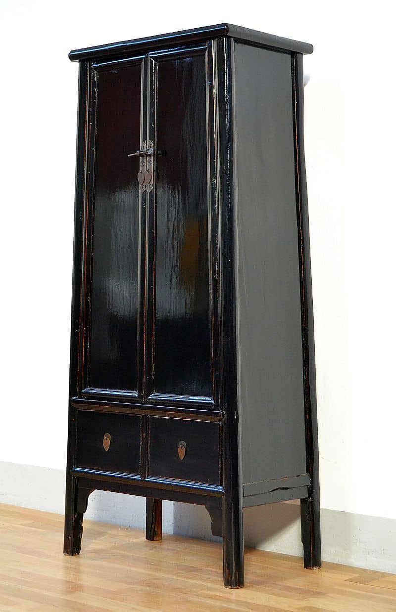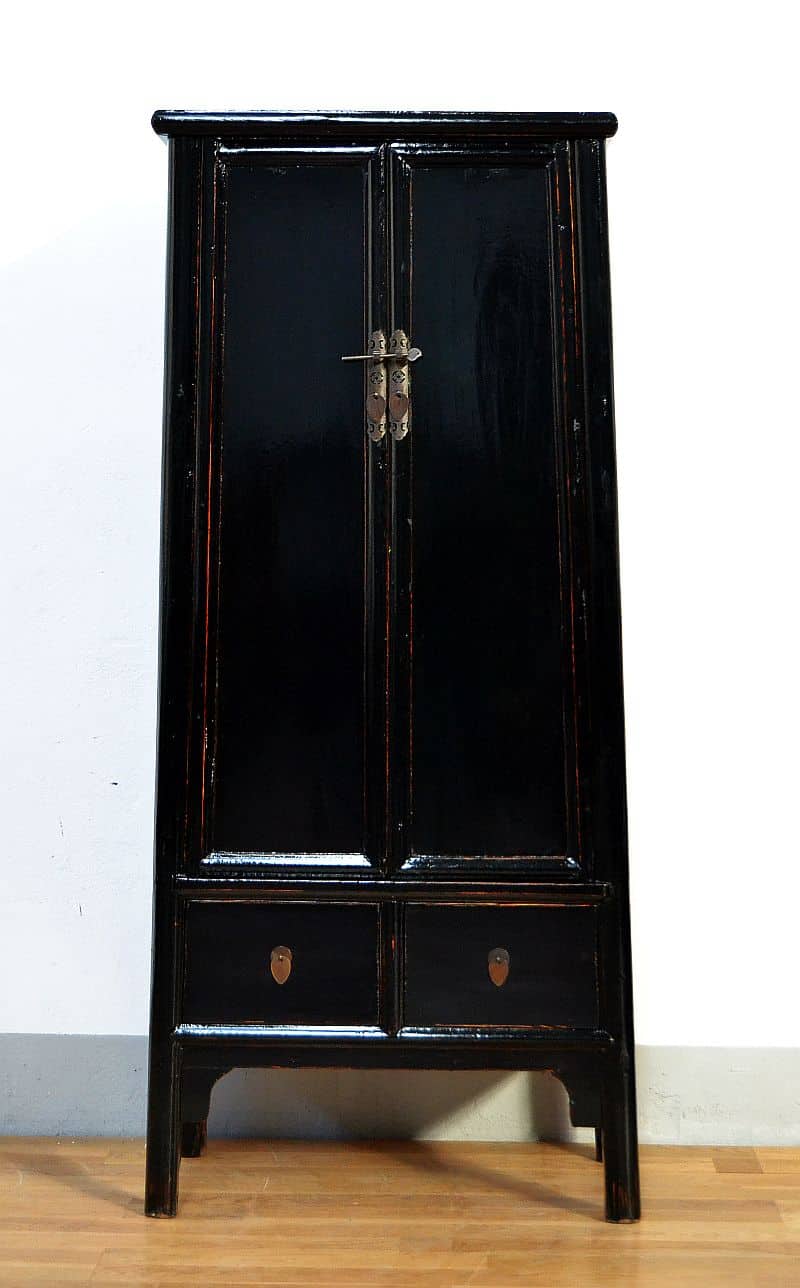 Armadio Cinese antico in lacca nera decapata con tipica forma a trapezio di Pechino dianstia Qing, utilizzabile anche come credenza orientale per il soggiorno o la cucina, questo armadio in legno massello di olmo ha una base lacca nera lucida e la sua apertura è a 2 sportelli con 2 ripiani interni e 2 cassetti in basso. Le parti laterali sono in patina nero lacca. Classici accessori di apertura in ottone brunito. ( trasformabile su richiesta in appenderia)