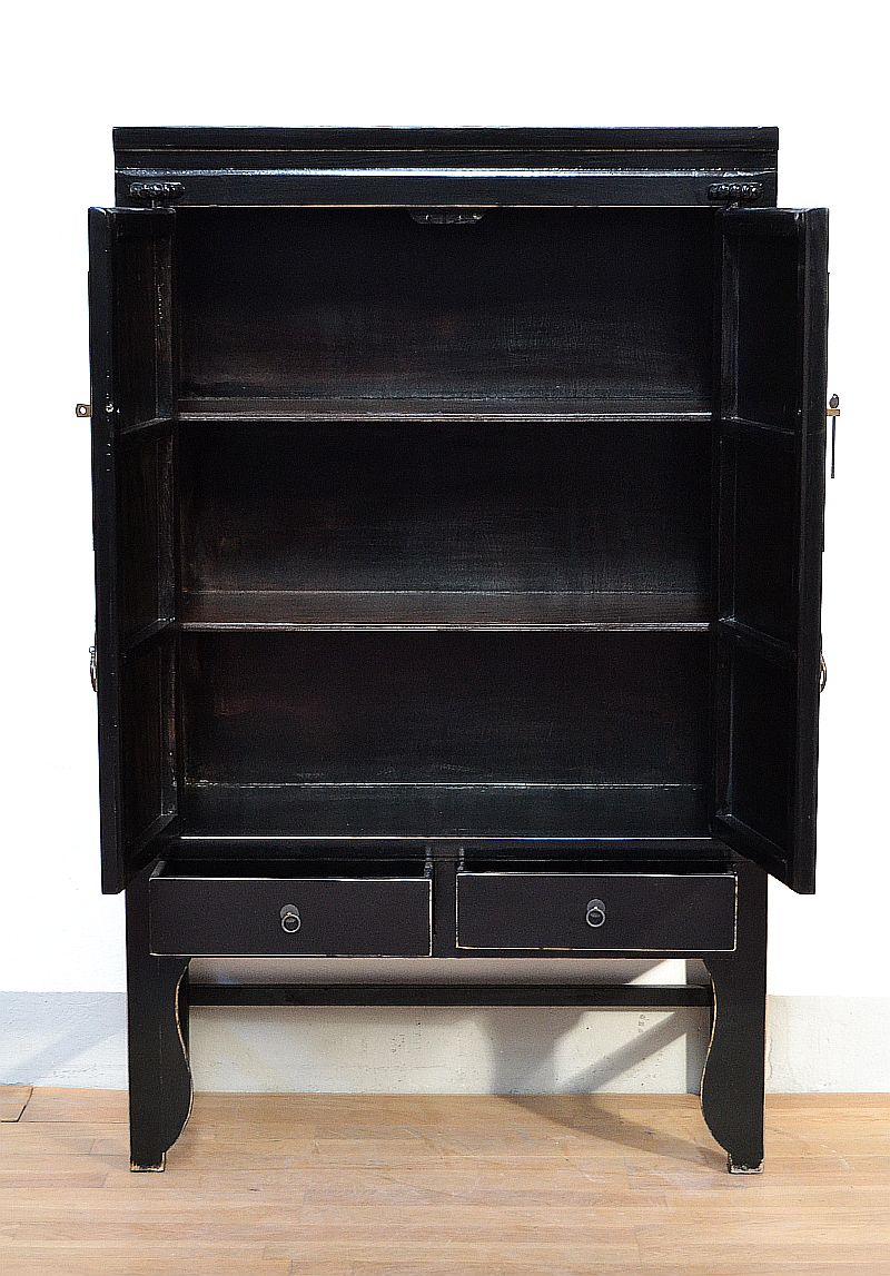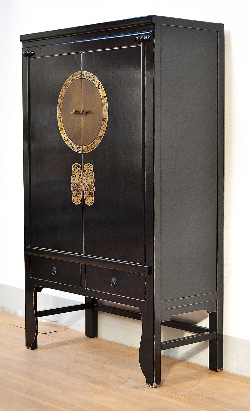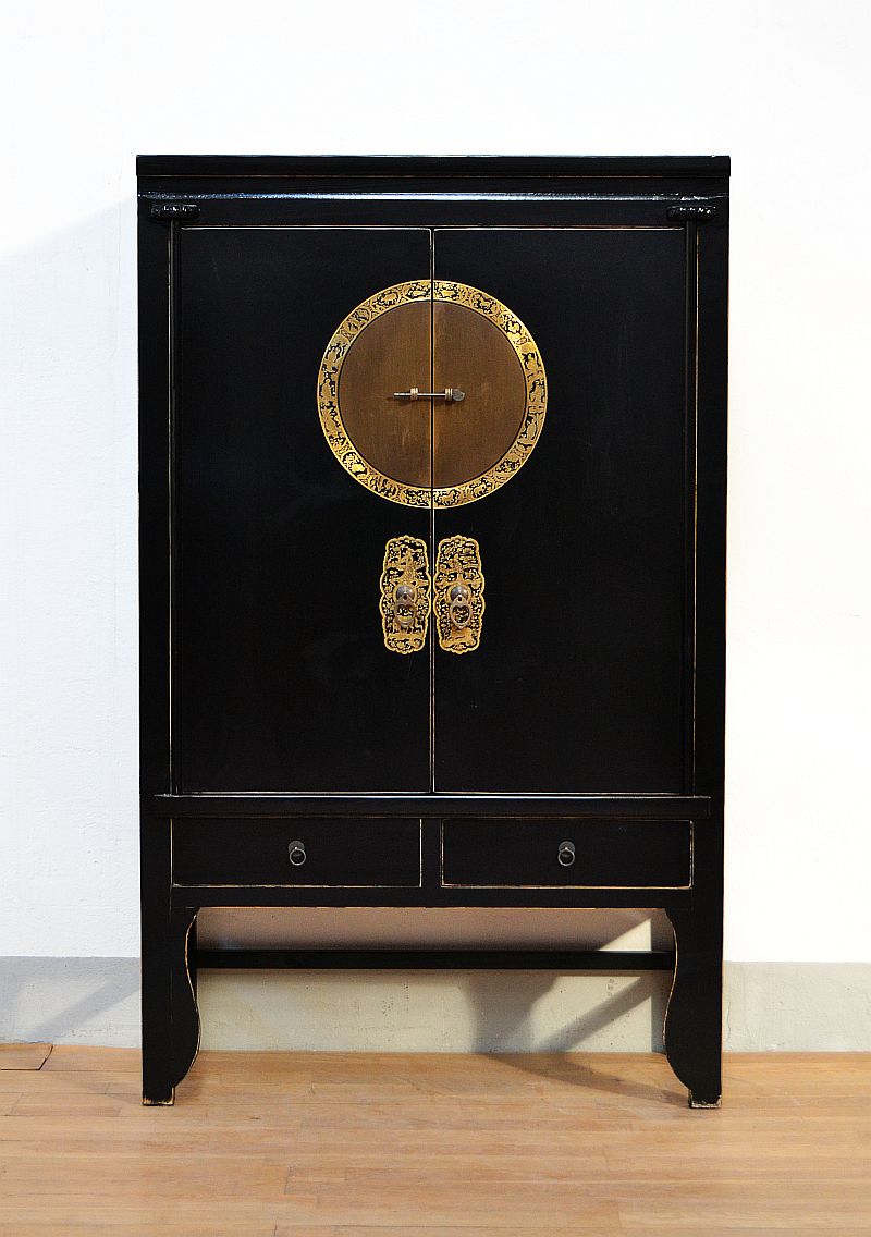 Armadio nuziale cinese nero, dispensa cinese laccata nera con lieve effetto decapato antichizzato. Di nuova fattura ma ricostruita in perfetto in stile Ming, con classici accessori in ottone brunito Pechinesi , il medaglione in ottone è inciso con l’oroscopo Cinese, All’interno 2 ripiani  Apertura : 2 sportelli più 2 cassetti inferiori. Trasformazione in appenderia compresa nel prezzo.