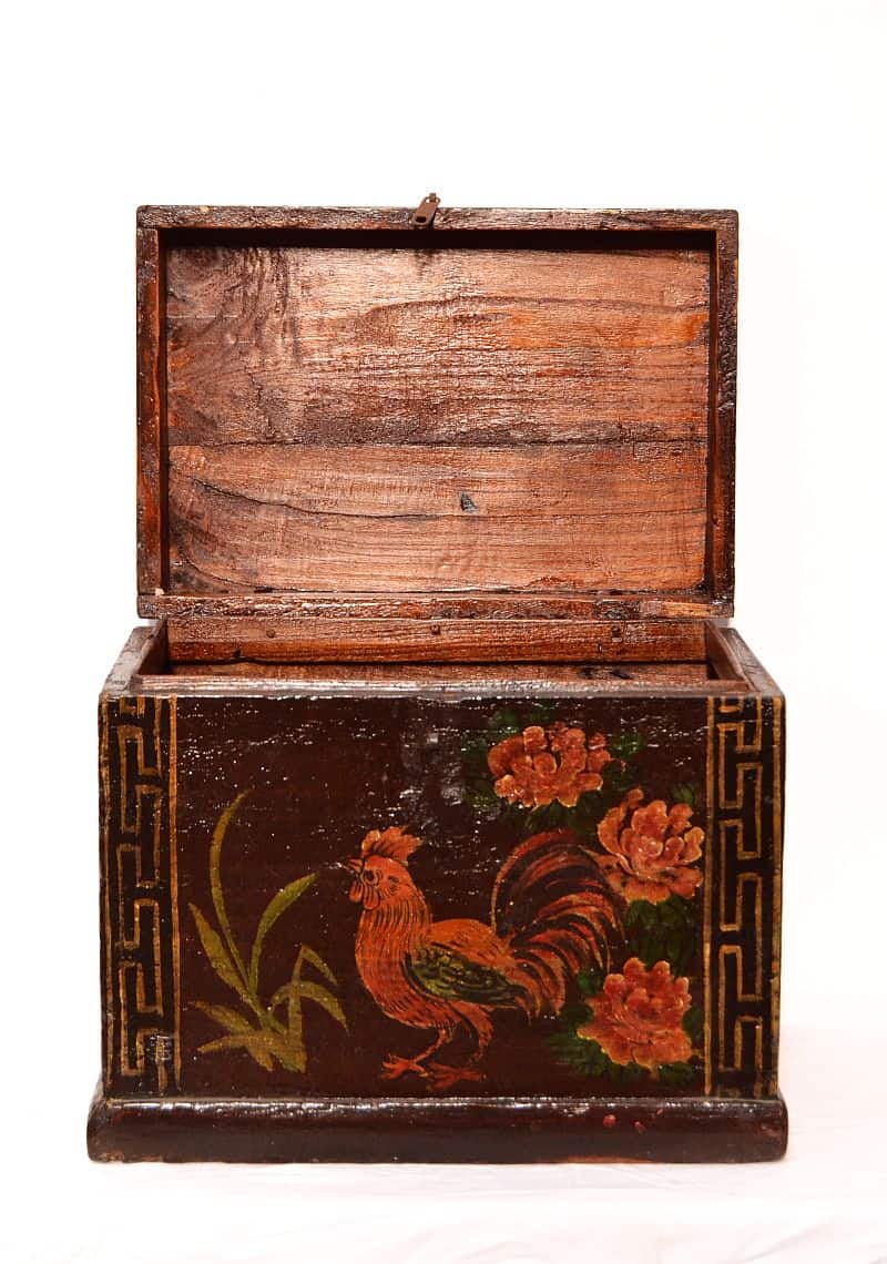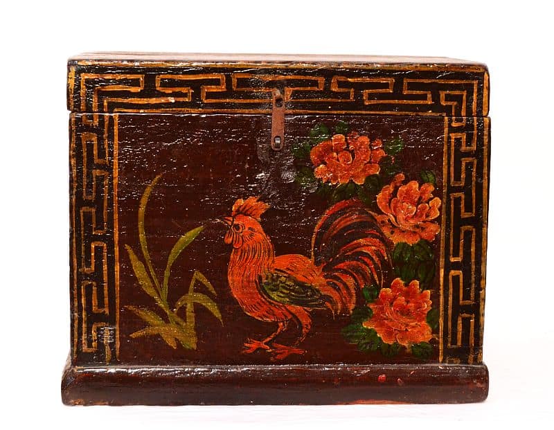 Bauletto orientale cinese in lacca policroma originale con bellissimi dipinti policromi dell’epoca gallo e fiori, classici accessori di chiusura in ferro forgiato. Apertura: a baule, piano superiore e parti laterali in patina mogano scuro