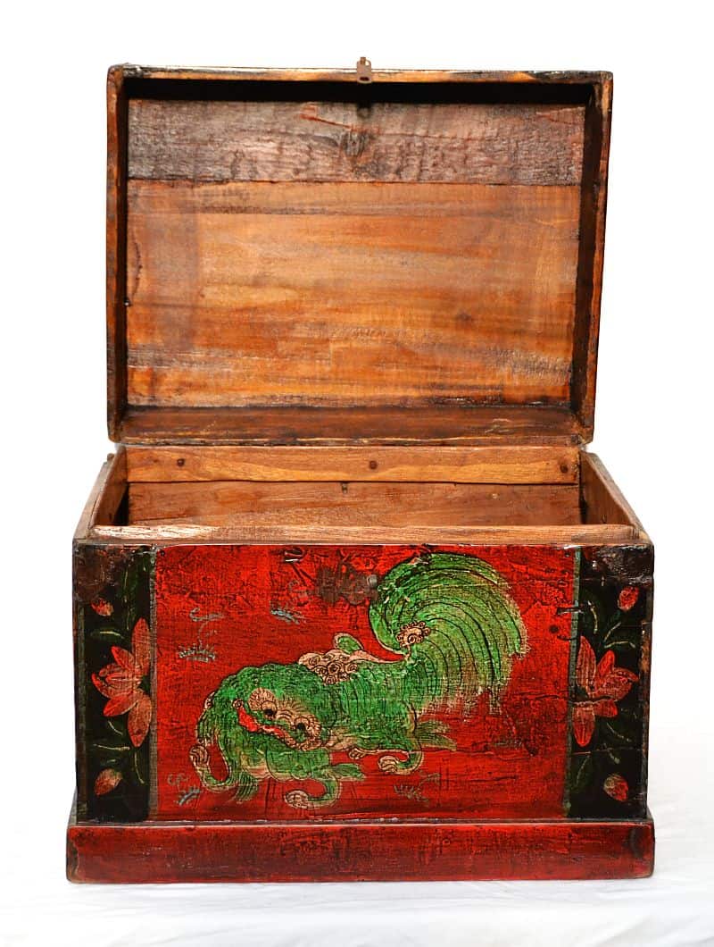 Bauletto orientale mongolia cinese in lacca policroma originale con bellissimi dipinti policromi dell’epoca cane leone Foo, base rosso lacca con classici  accessori di chiusura in ferro forgiato. Apertura: a baule,  piano superiore e parti laterali  in patina noce scuro.