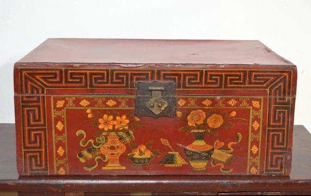 Questo mobiletto cinese ad uso baule etnico da viaggio è un classico esempio di antiquariato cinese, con bellissimi decori policromi originali, in pino laccato. I decori dei mobili laccati cinesi sono un raro elemento distintivo della collezione di mobili etnici e mobili dal mondo di Arredare Senza Confini.