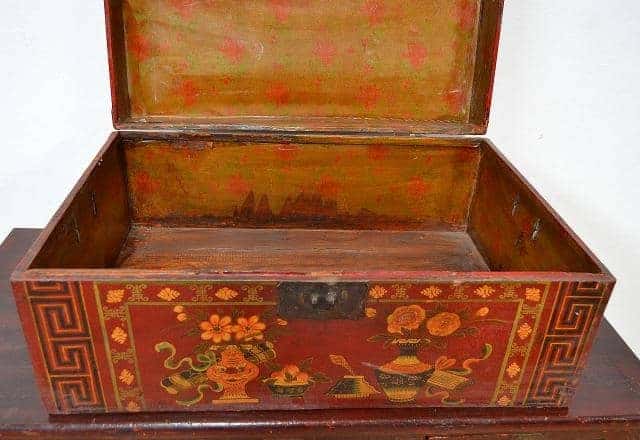 Antico baule etnico da viaggio finemente decorato con decori floreali policromi. In lacca cinese rossa, con classici accessori in ottone e ferro originali, questo baule antico proviene direttamente dall’antica Mongolia. Utilizzabile come baule etnico contenitore da mettere ai piedi del letto, o come complemento d’arredo etnico del tuo salotto o casa etnica.