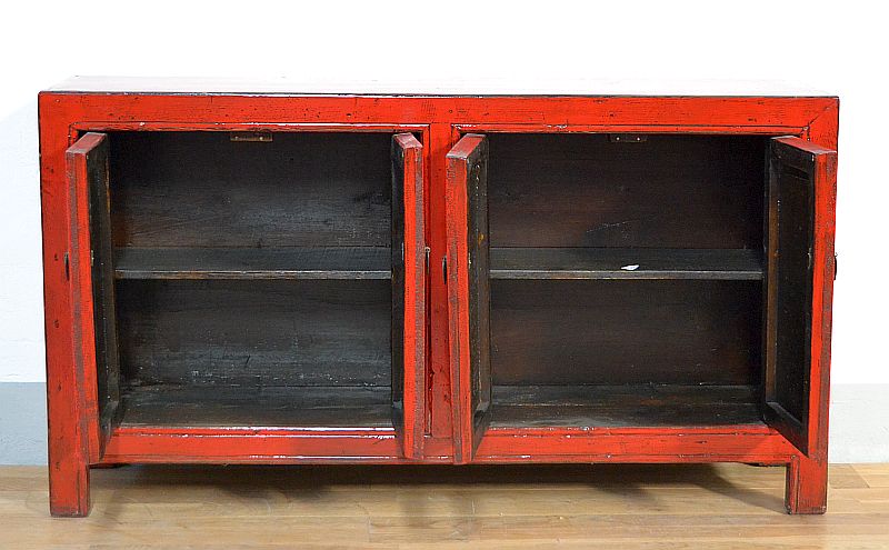 Buffet cinese credenza in lacca rossa, antica originale della dinastia Qing con classico disegno Shanxi, legno di olmo massello, medie dimensioni, presenta una bellissima laccatura in patina rosso cina originale. L’apertura è a 4 sportelli centrali con ripiano centrale interno, le parti laterali sono in patina rosso lacca come anche il piano superiore.