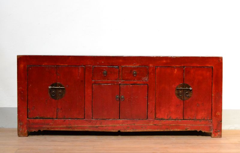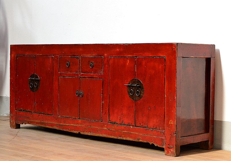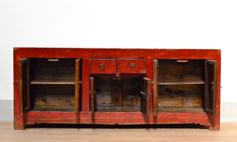 Arredare Senza Confini vi propone questa credenza etnica Cinese in lacca bruno rosso originale 1890 , apertura a 3 sportelli con 3 vani separati e 2 cassettini superiori. Le parti laterali sono rosse come il frontale mentre il piano superiore è in patina noce medio , con classici accessori circolari di apertura in ottone brunito. Adatta come mobile tv o come complemento di arredamento etnico, questo pezzo unico è uno dei più pregiati della collezione di antiquariato orientale. Una madia etnica in stile unico e raffinato per completare l’arredo etnico della tua cucina o del tuo salotto.