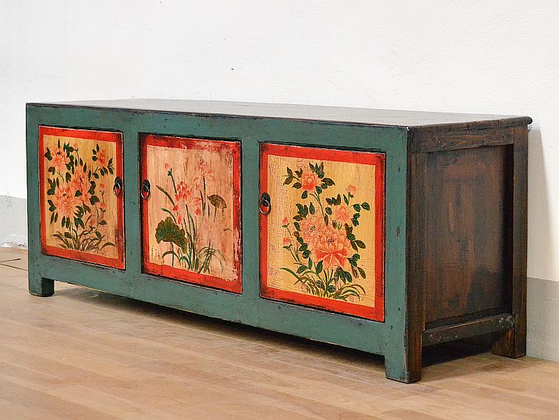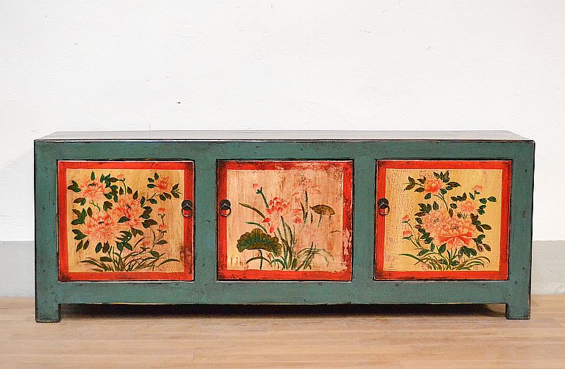 Arredare Senza Confini vi propone questa credenza orientale in lacca originale con bellissimi decori policromi floreali dell’epoca Apertura a 3 sportelli decorati . Le parti laterali sono in panita noce medio, mentre il piano superiore è in lacca azzurra ottanio come la cornice frontale, classici accessori di apertura in ottone.