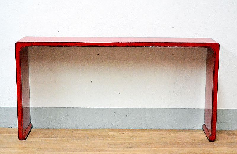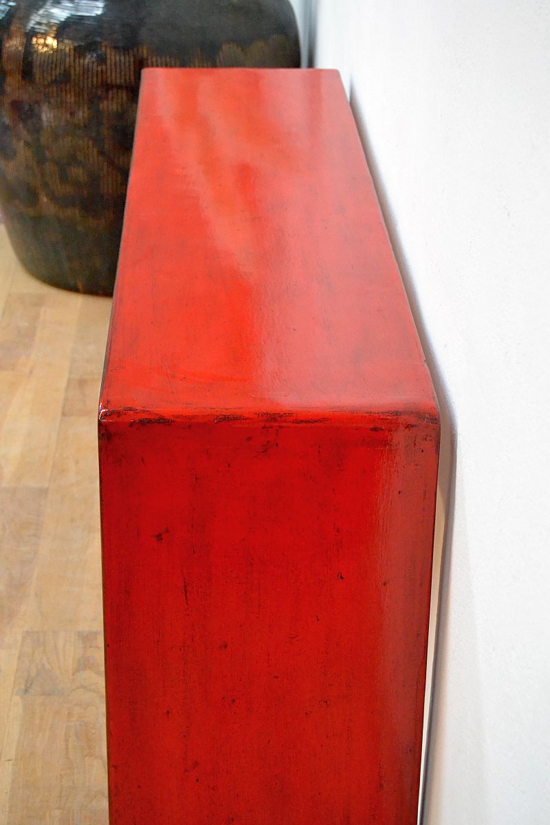 Consolle cinese in lacca rossa stile Ming di origini cinesi in legno massello di olmo ; lacca originale rossa rilucidata , stile Minimal orientale ming (restauro conservativo), lato posteriore in patina rossa , piano superiore rosso come il frontale.