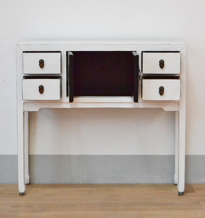 Consolle cinese bianca che riporta le caratteristiche di un tipico tavolino orientale. Laccato bianco con lieve effetto decapato. Presenta 4 cassetti + 2 piccoli sportelli centrali. La consolle è stata realizzata seguendo i canoni classici della dinastia Qing.
