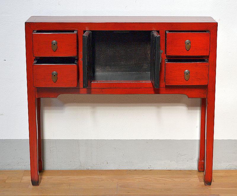 Piccola consolle cinese e tavolino orientale laccato in un elegante rosso antichizzato, con classici motivi della dinastia Qing che richiamano la tradizione artistica cinese. Dotata di quattro cassetti e due sportellini centrali, è un mobile versatile e pratico, perfetto per arricchire ingressi, corridoi o disimpegni grazie alla sua profondità ridotta. La consolle è disponibile anche nella raffinata variante nera, offrendo la possibilità di adattarsi a diversi stili di arredamento.