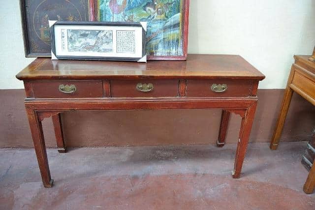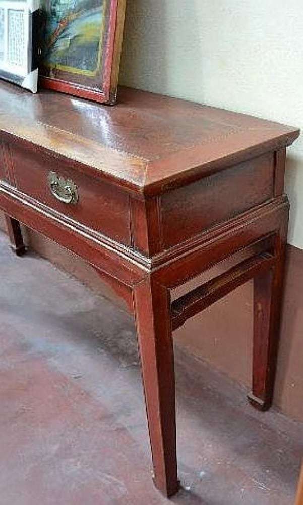 Consolle cinese di epoca Qing in legno di olmo massello lacca rossa/bruna con patina originale. 3 cassetti. Classico motivo alle zampe di epoca 1800.