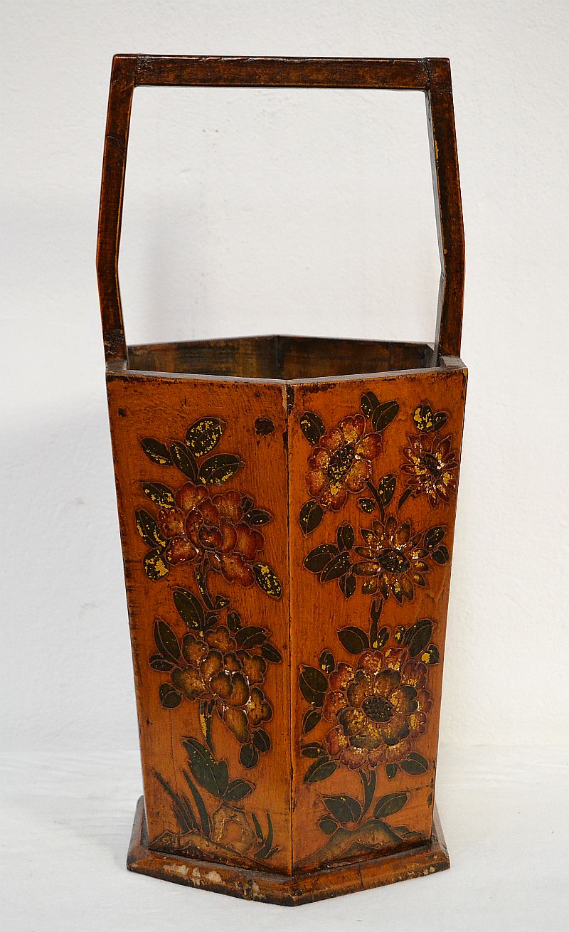 Contenitore Tibetano portariso in legno di pino decorato , con caratteristica forma esagonale dipinto con motivo floreale databile anni 70 , autentico e conservato nessun elemento rifatto o sostituito interamente costruito ad incastro senza l’ultilizzo di parti in metallo. (Restauro Conservativo) La finitura è in lacca arancione bruno . La provenienza di questo complemento d’arredo è la Regione autonoma del Tibet