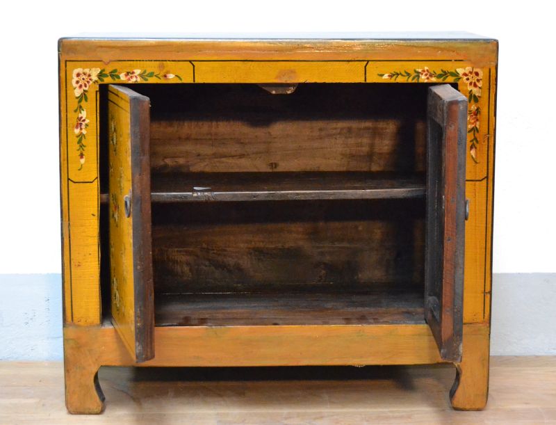 Mobiletto orientale originale credenza Gansu con bellissimi decori floreali policromi base in lacca gialla . Le parti laterali e il piano superiore sono in patina noce scuro. Il mobiletto presenta anche classici accessori in ottone.