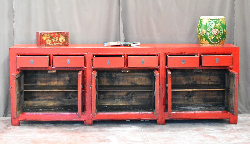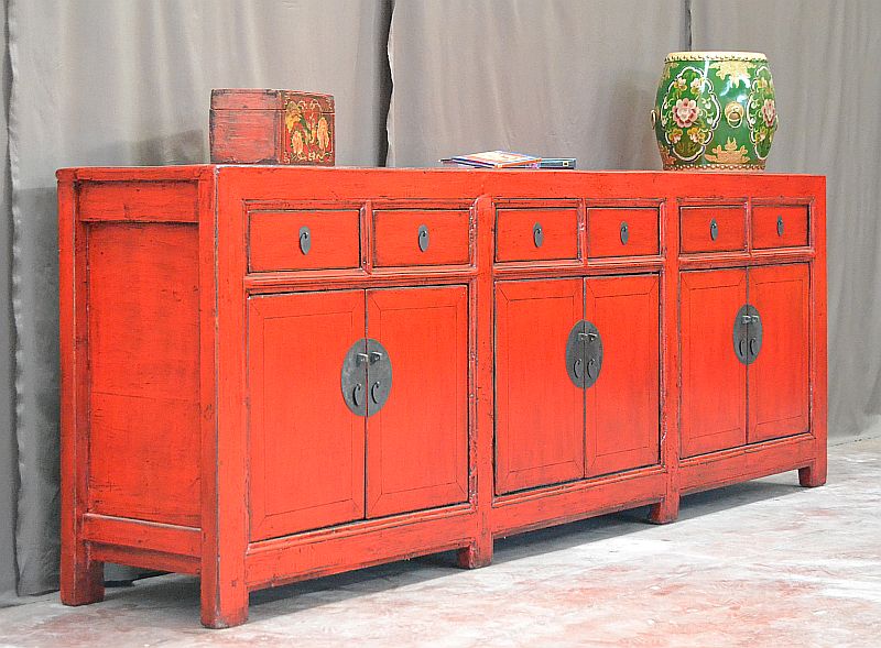 Questa grande credenza cinese può essere usata come mobile da soggiorno o come complemento di arredamento etnico, questa credenza cinese in lacca rosso cina è un pezzo unico della nostra collezione di antiquariato orientale. Una madia etnica raffinata per completare l’arredo etnico della tua cucina o del tuo salotto.