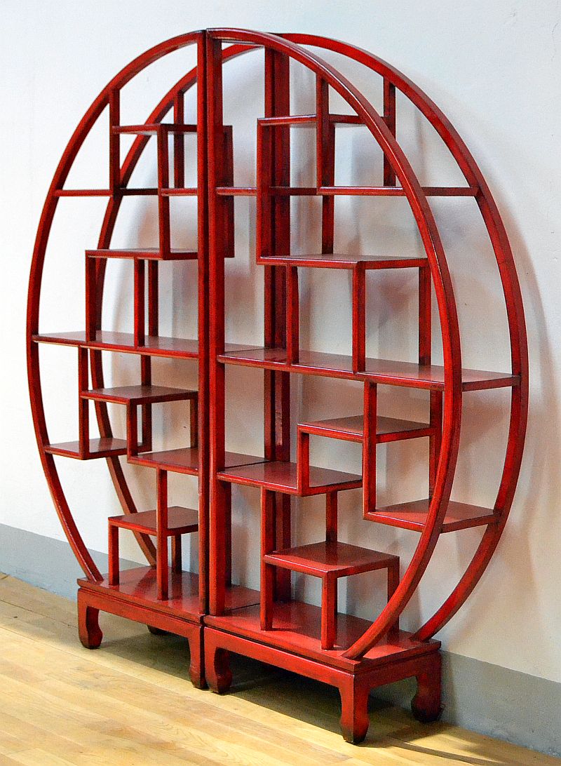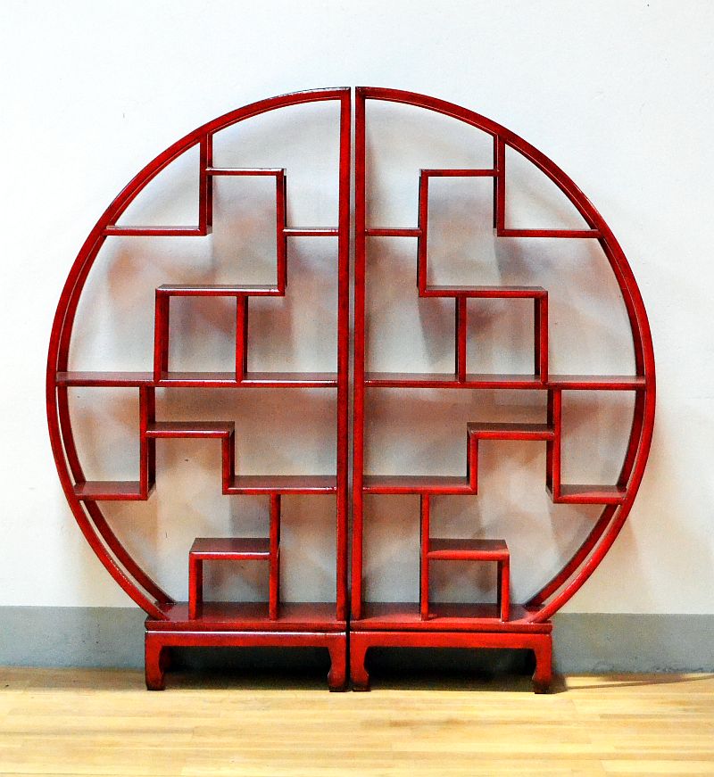 Bellissima libreria etagere in stile classico cinese a disegno circolare con ripiani sfalsati classico disegno ming lacca rossa con lieve effetto antichizzato (utilizzabile da entrambi i lati) divisibile in 2 pz a mezza luna