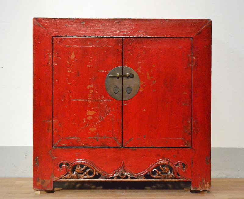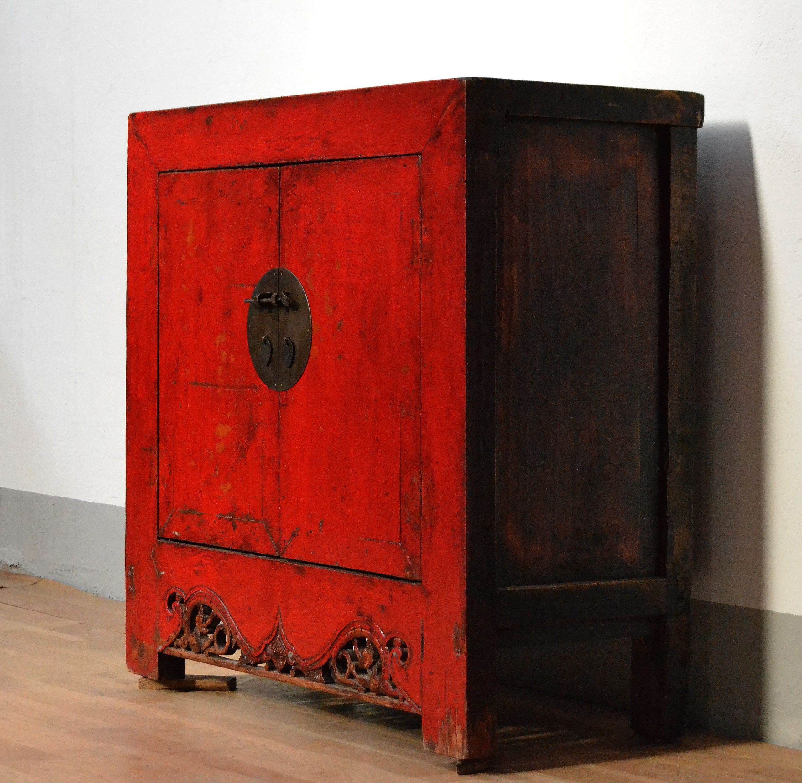 Credenza cinese originale laccato Rosso , di piena dinastia Qing in legno massello di olmo, apertura composta da 2 sportelli con ripiano all’interno, balza inferiore finemente intagliata , classici accessori di apertura in bronzo. Le parti laterali sono in patina noce scuro, mentre il piano superiore è in lacca rossa come il frontale.