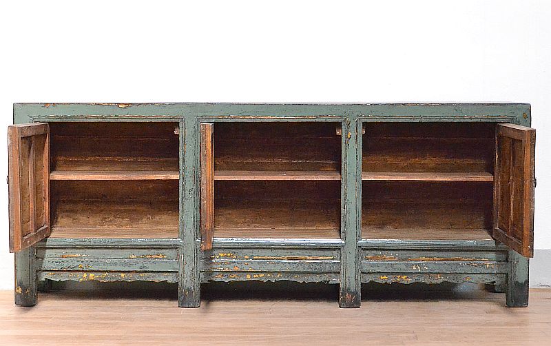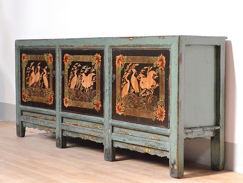 Mobile etnico cina credenza orginale orientale in legno di pino massello. Questo antico mobile cinese è laccato con bellissimi decori animali Ibis policromi a base lacca color salvia e giallo ocra.