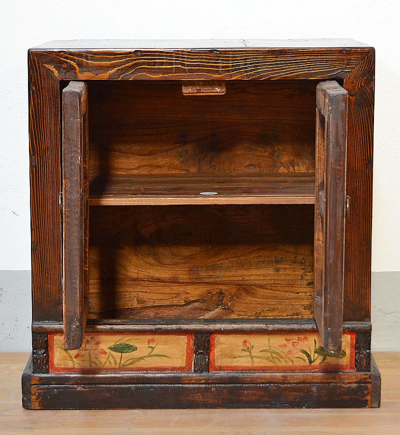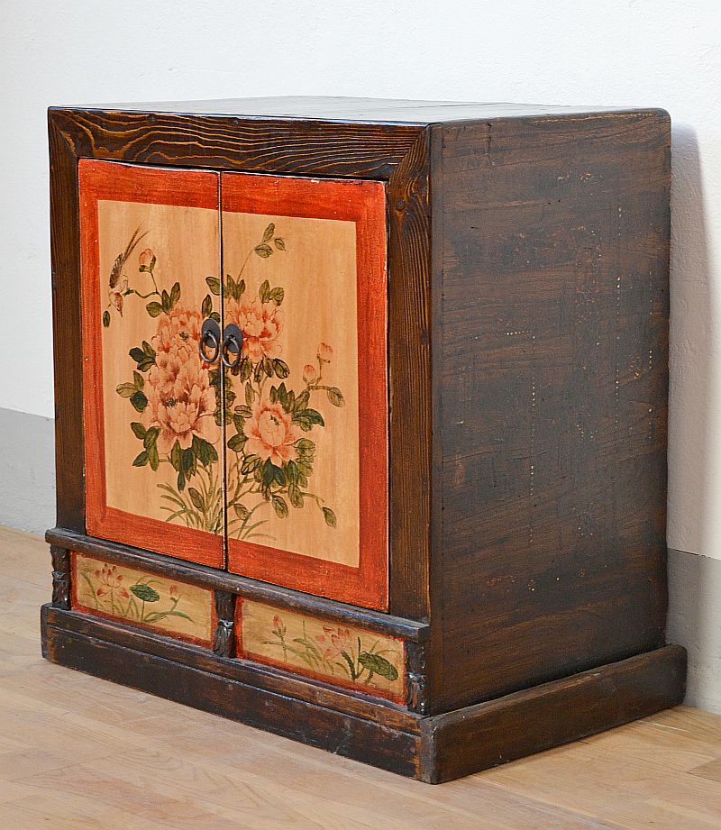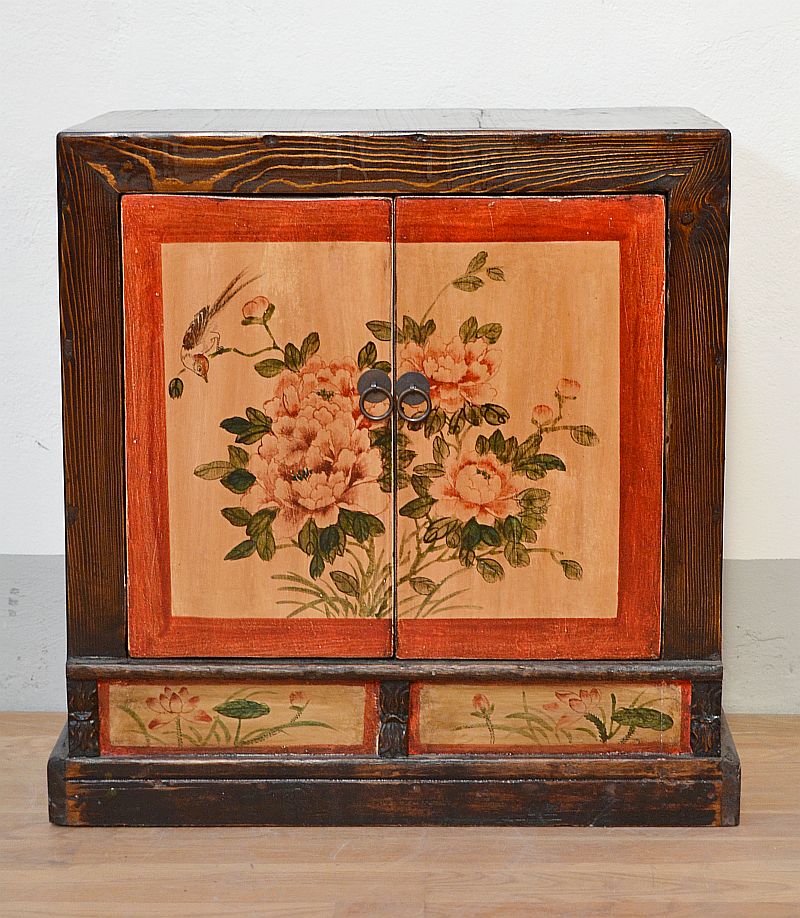 Bella credenza mongola orientale in legno di conifera massello laccato con bellissimi decori floreali policromi a base in lacca giallo ocra. Parti laterali in patina noce medio come anche il piano superiore.