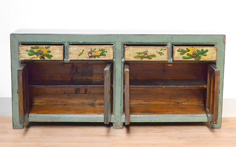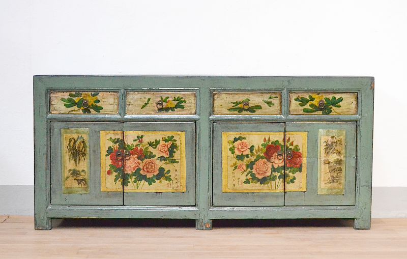 Mobile etnico mogolia credenza orginale orientale in legno di pino massello. Questo antico mobile Gansu è laccato con bellissimi decori floreali e animali policromi a base lacca color salvia e giallo ocra.