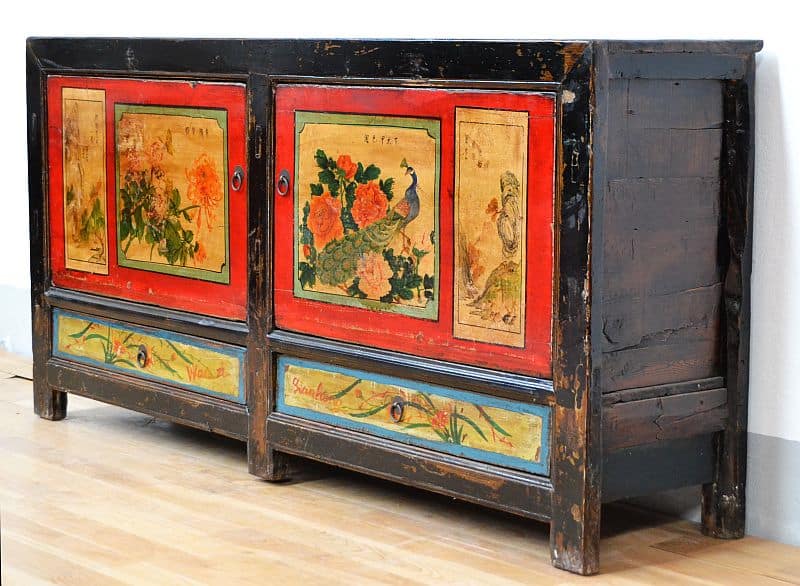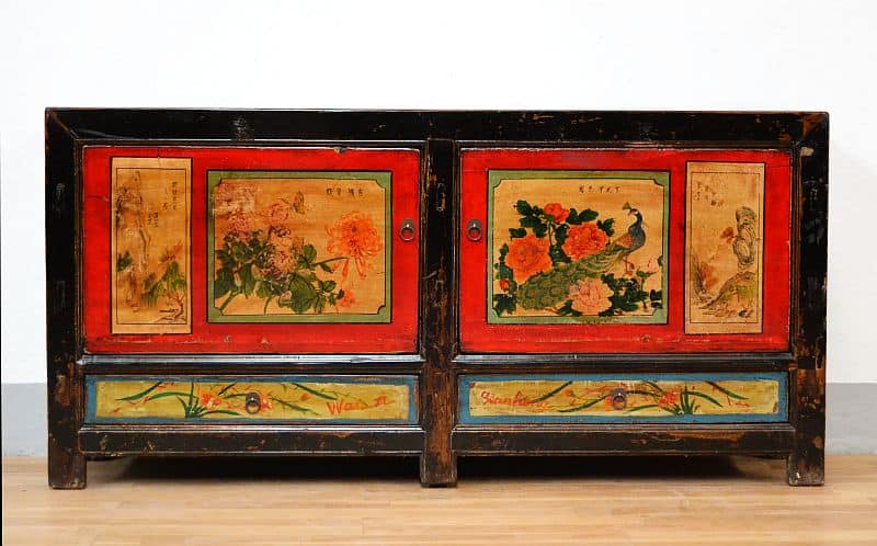 Mobile etnico mogolia credenza orginale orientale in legno di pino massello. Questo antico mobile Gansu è laccato con bellissimi decori floreali e animali policromi a base lacca rosso e giallo ocra.
