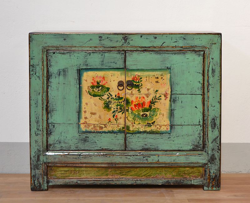 Mobile mongolia credenza orientale azzurra verde dei primi del 1900 con apertura frontale. Di medie dimensioni, presenta decori policromi florali finemente realizzati all’epoca. In lacca originale e fianchi laterali in patina color noce medio,  il piano superiore è celeste come il frontale. L’apertura è a 2 sportelli con ripiano all’interno . (restauro conservativo)