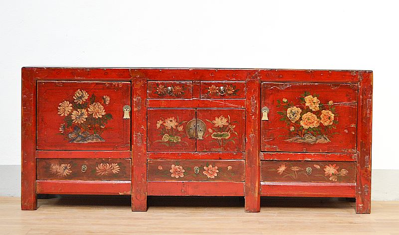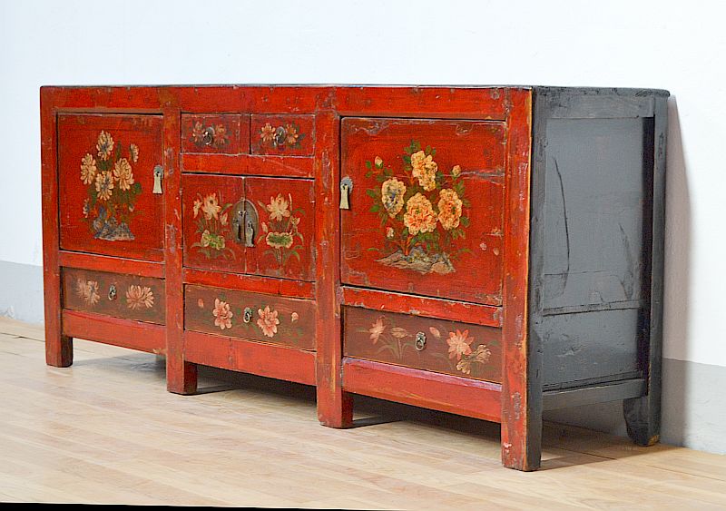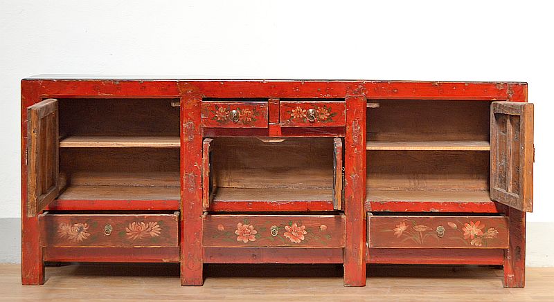 Mobile mongolia credenza orientale rossa dei primi del 1900 con apertura frontale. Di grandi dimensioni, presenta decori policromi florali finemente realizzati all’epoca. In lacca originale parti laterali in patina nera, mentre il piano superiore è in patina rossa come il frontale . L’apertura è a 3sportelli e 3 vani separati con ripiano all’interno e 5cassetti decorati. (restauro conservativo)