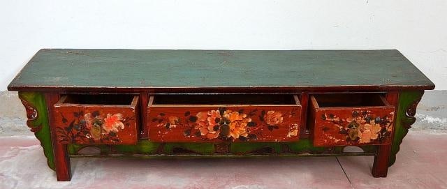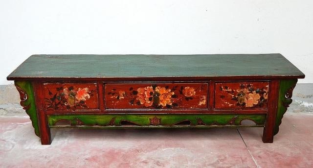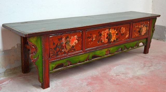 Antica Panca mongolia con intagli e decorazione policroma. 3 cassetti. Piano superiore in lacca verde scuro, adatta anche come mobile TV.
