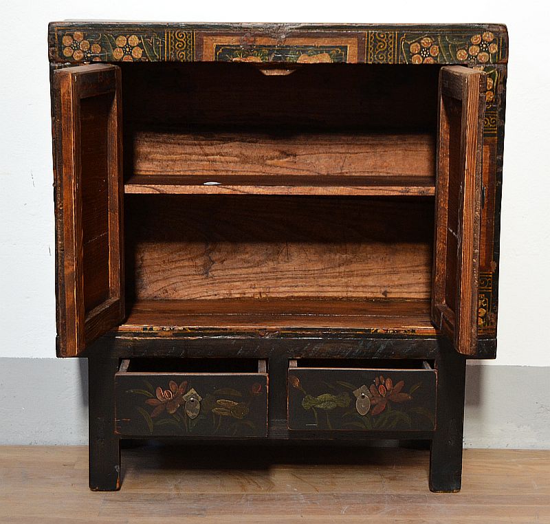 Questa antico mobiletto Cinese, è un autentico mobile d’artigianato orientale, si distingue per le dimensioni compatte e il design originale. Realizzata in legno di pino massello laccato, questa credenzina presenta un vano superiore chiuso da due antine, mentre le gambe sono presenti 2 cassetti, aggiungono un dettaglio unico che rende questo pezzo esclusivo tra i mobiletti etnici decorati. Le decorazioni includono motivi floreale pechinese, elementi distintivi dell’Opera di Pechino che donano eleganza e richiamano la bellezza della cultura cinese.