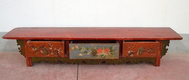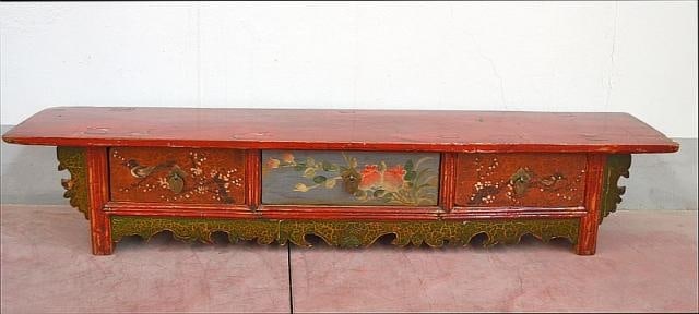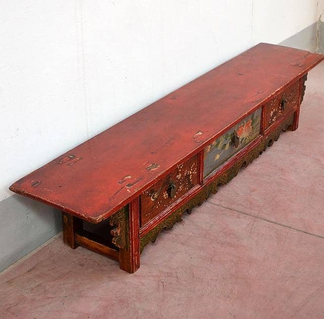 Panca mongola con decorazione policroma sfruttabile come base tv o Panca etnica. Di origine mongola con intagli e decorazioni policrome e apertura a 3 cassetti. Il piano superiore è in lacca rossa, adatto anche ad ingressi o i luoghi più angusti di casa. Epoca: inizio del 900