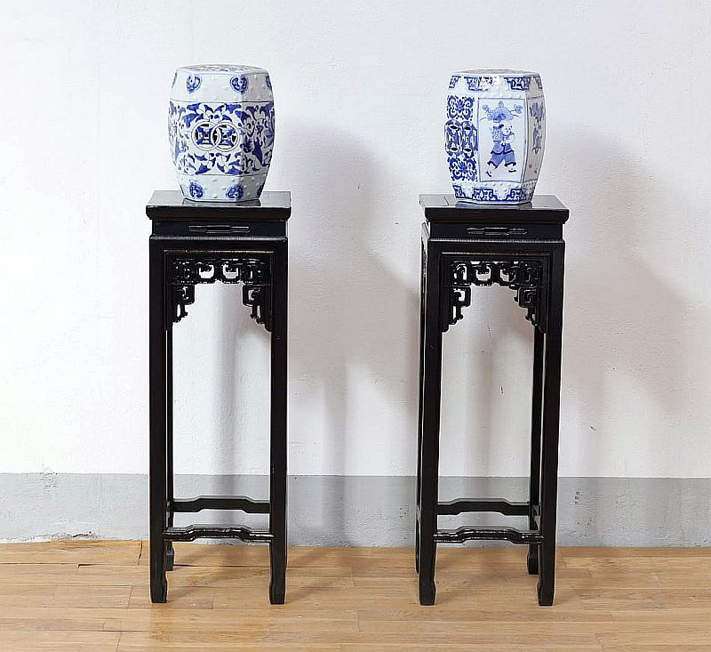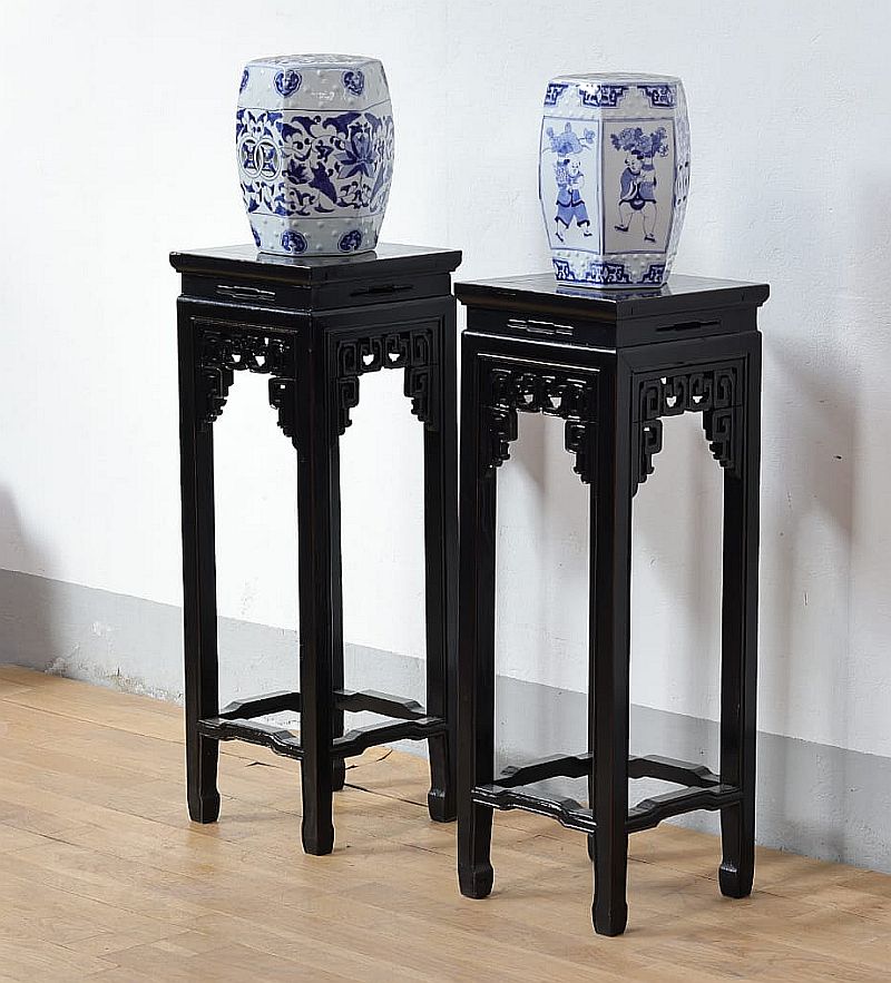 Elegante Portavaso cinese in bellissimo legno massello di pino e patina nero lacca finemente realizzato, costruzione ad incastri , classici intagli e decorazioni della tradizione cinese. Disponibile la coppia
