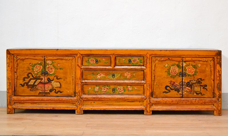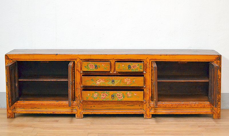 Rara credenza cinese lacca giallo arancio con decori policormi 1880′. Mobile cinese di medie dimensioni, in particolare lacca gialla, impreziosita con bellissimi decori policromi floreali dell’epoca. Apertura: 4 sportelli con ripiano centrale interno 2 vani separati più 4 cassetti centrali. Classici accessori in ottone brunito (parti laterali e piano superiore in lacca noce medio).