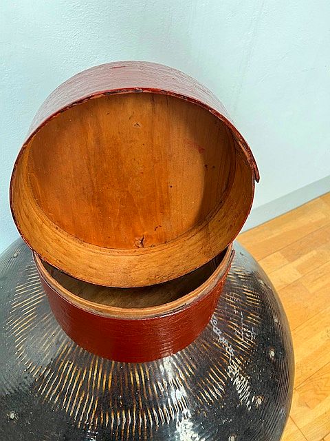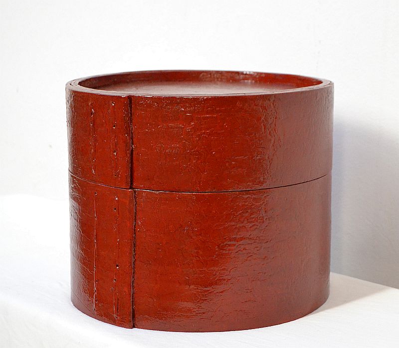 Scatola cinese porta Kimono tonda in lacca originale rosso bruno , Epoca 1920′ circa Cappelliera cinese in legno dalla tradizionale forma cilindrica, con relativo coperchio , legno sapientemente curvato a vapore (Restauro Conservativo) La finitura è in lacca rosso bruno . La provenienza di questo complemento d’arredo è la Regione Settentrionale cinese del Ganzu.