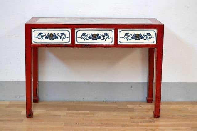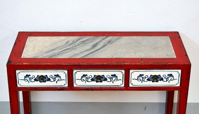 Scrittoio cassettiera cinese laccata rossa in legno di olmo massello con particolare marmo sul piano superiore. La struttura di questo tavolo cinese è molto pesante, a causa dello spesso piano di marmo superiore. Una tipica cassettiera cinese, utilizzabile ancora come scrittoio oppure come cassettiera cinese o tavolo etnico da ingresso.
