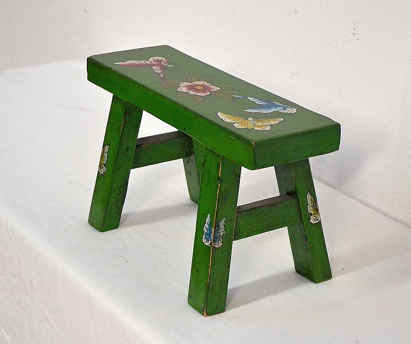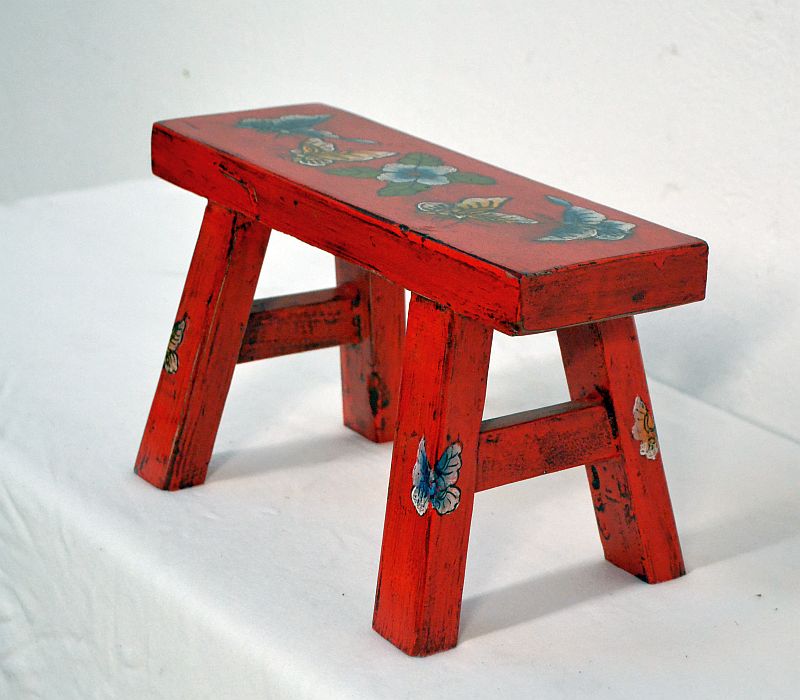 Sgabelli della Manciuria in legno decorato usati in origine come panchetto, bellissimi decori di farfalle e fiori dipinti a mano , legno massello di pino laccato, linee essenziali, costruzione tutta ad incastri, patina media. Disponibile attualmente solo nella colorazione in nero lacca.
