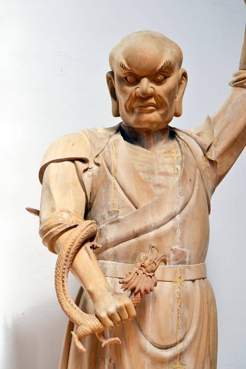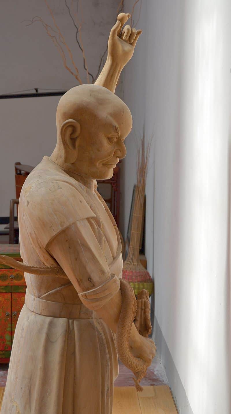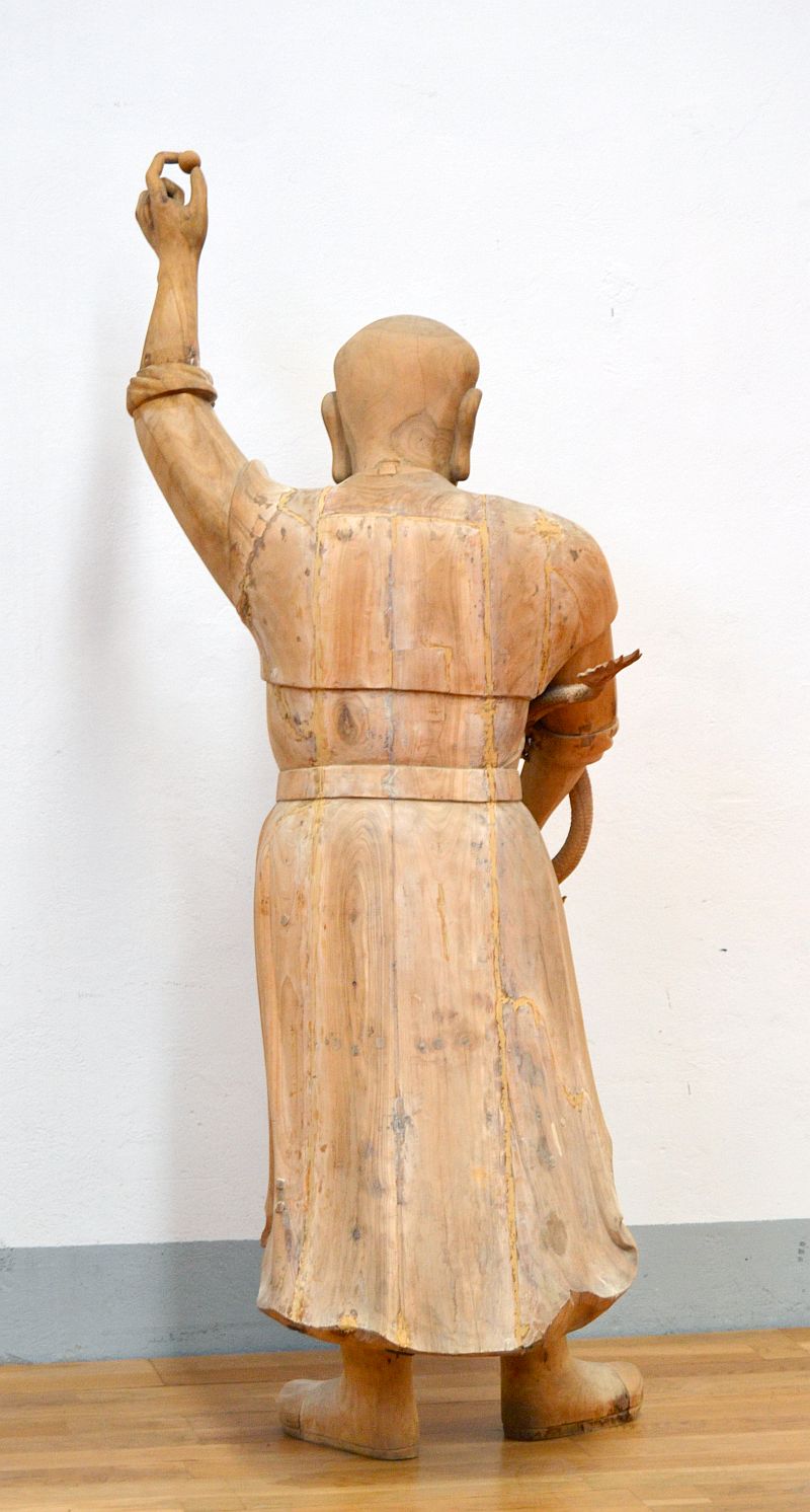 Statua orientale rappresentante un Lohan uno dei 18 protettori del  buddha con Drago scolpito in una mano.