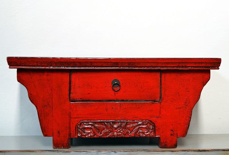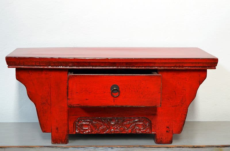 Antico tavolino da lettura Cinese di epoca Qing di forma elegante e lineare con cassetto , laccatura rossa originale. Parti laterali e piano superiore in patina rosso cina, legno di olmo massello epoca 1910’circa . Classico motivo della dinastia Qing sulla balza inferiore.