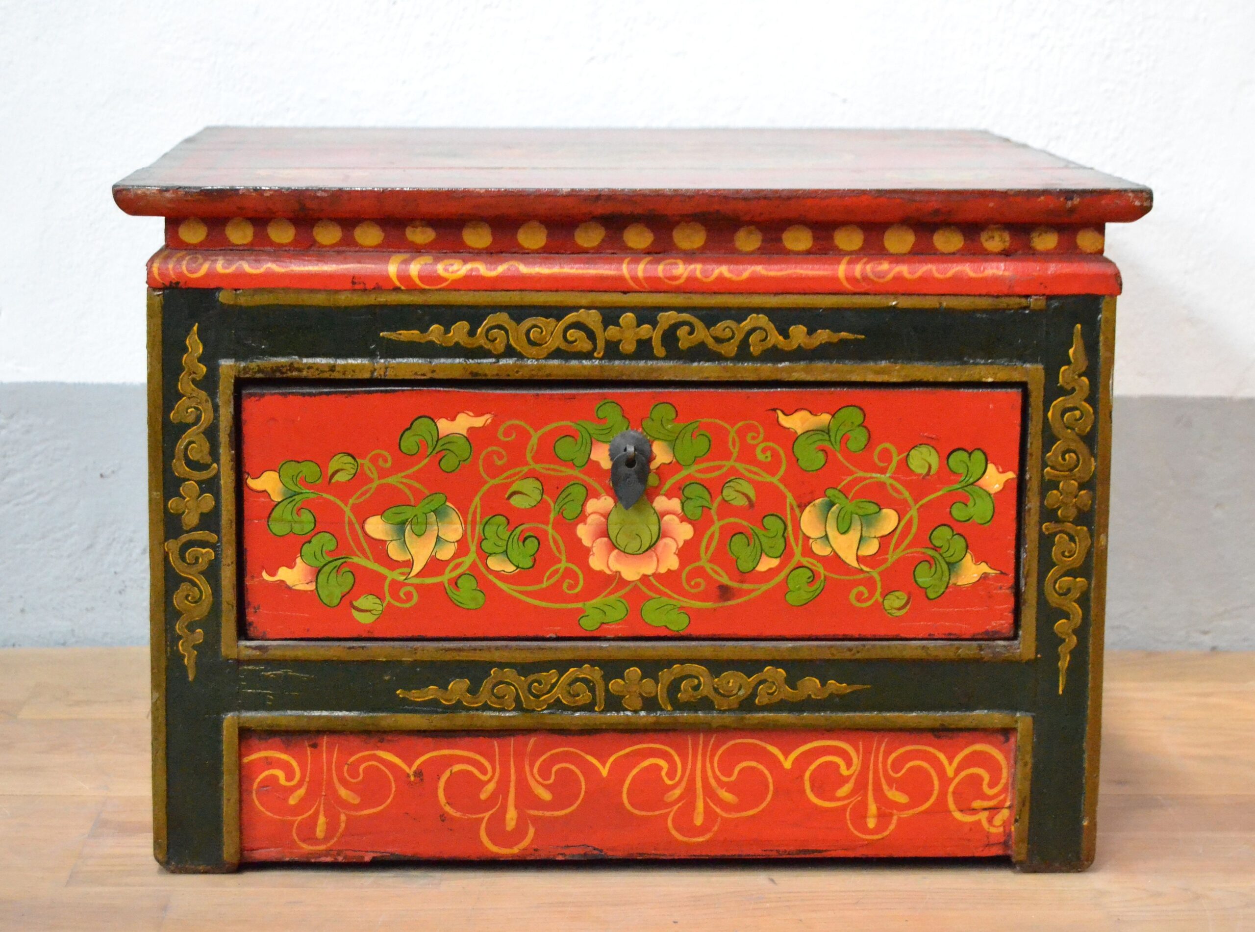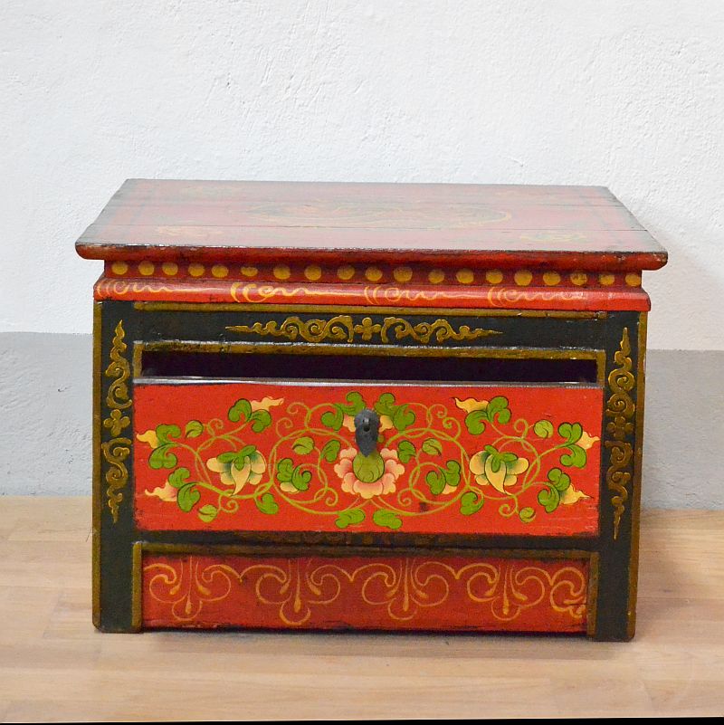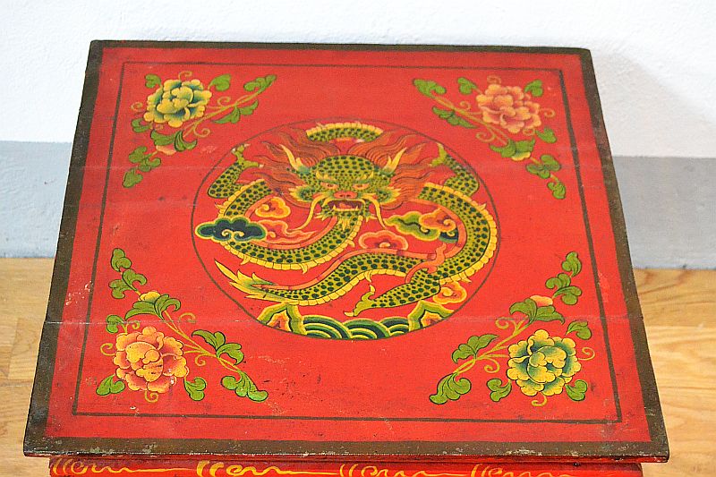 Antico tavolino tibetano orientale da fumo con finissimi decori policromi, raffiguranti dipinti di simbologia floreale e monastica tibetana. Decorato su tutti e quattro i lati. Il tavolino tibetano è comprensivo di un cassetto. I colori usati sono a pigmenti naturali, la finitura a gomma lacca. (Piano superiore con decoro di drago))