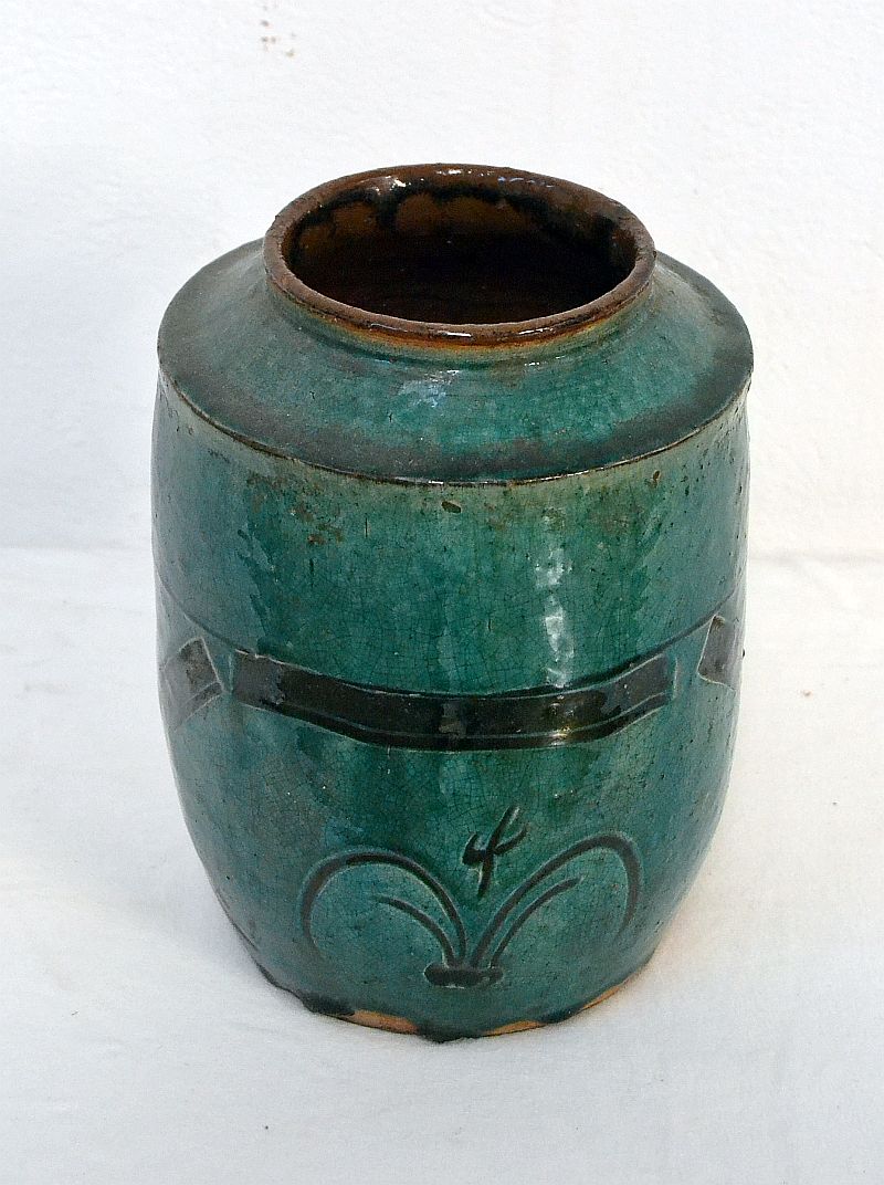 Vaso cinese in gres smaltato e invetriato color verde smeraldo con caratteristica decorazione ancestrale in rilievo ,Piena dinastia Qing 1880′ circa ,Giare cinesi originariamente usate per contenere alimenti e bevande.